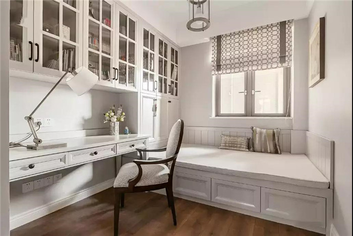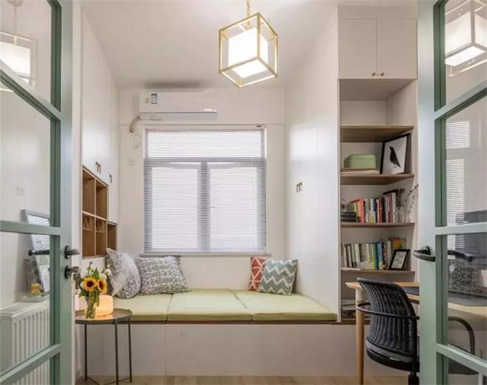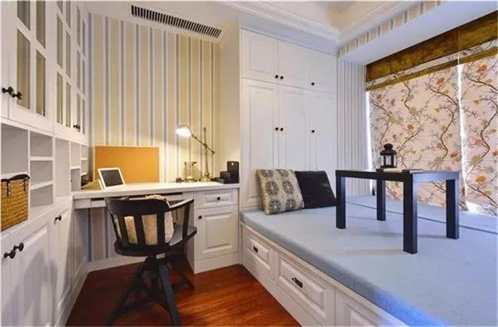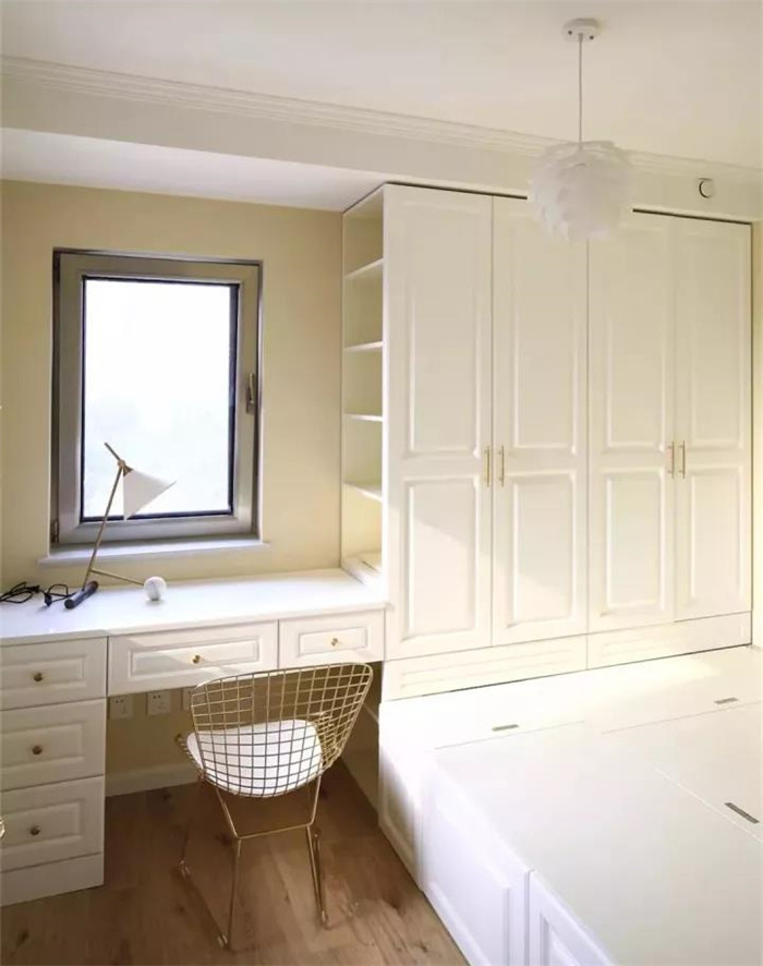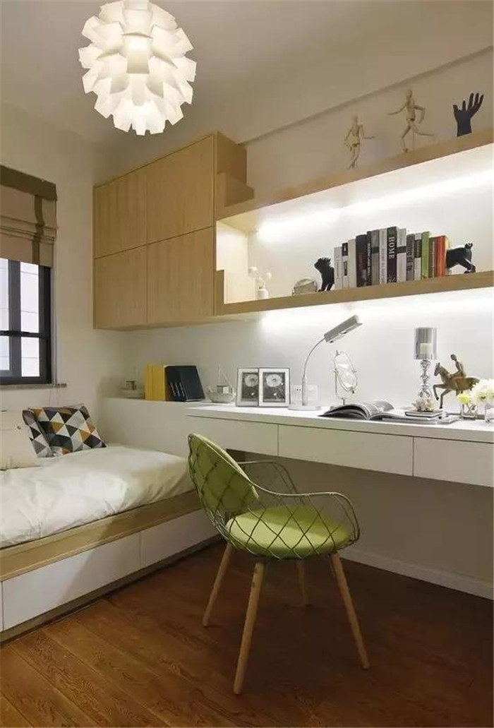 如果你希望安装榻榻米的这间房既可以当卧房又可以当书房,可以选择在榻榻米床头或者床尾安装衣柜、书架和书桌,这样不仅可以收纳衣物,也可以收纳书架用来办公,一举多得。
