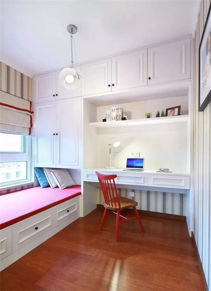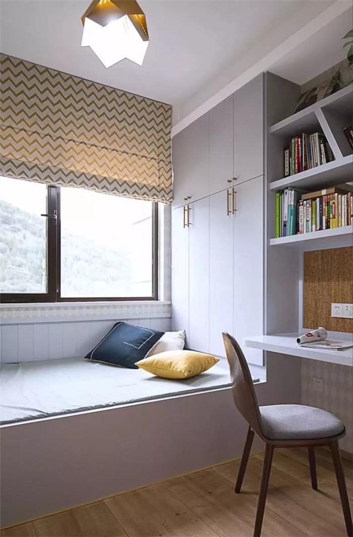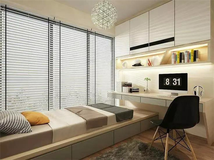 如果安装榻榻米的这间卧室,主要功能是书房或者书比较多的话,可以在榻榻米床的周围设计收纳书柜,如果床的长度不够,设计成吊柜也不错。