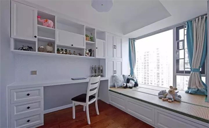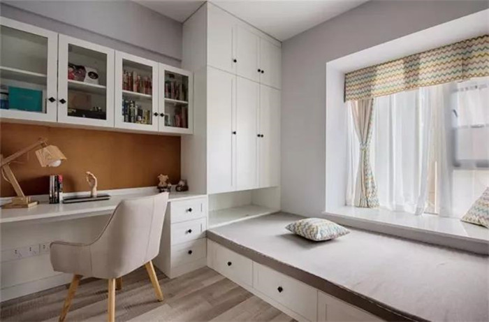为了丰富榻榻米房的书桌,也可以取消大面积的书柜与衣柜,直接把书桌延伸到床尾,床尾的地方也可以当作座位,电脑可以充当电视,躺在床上看剧,非常不错。