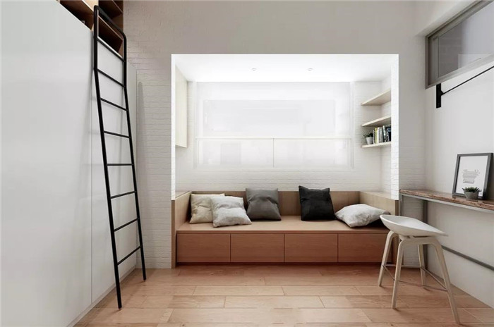 由于户型和面积的限制,榻榻米床不得不安排在窗户边,但是像下方这几个案例设计,虽然空间利用很完美,但是如果主要功能是卧室,尤其是落地窗紧挨着床的时候,楼层又很高,睡觉肯定会缺乏安全感。如果实在无法改变,可以加个护栏。