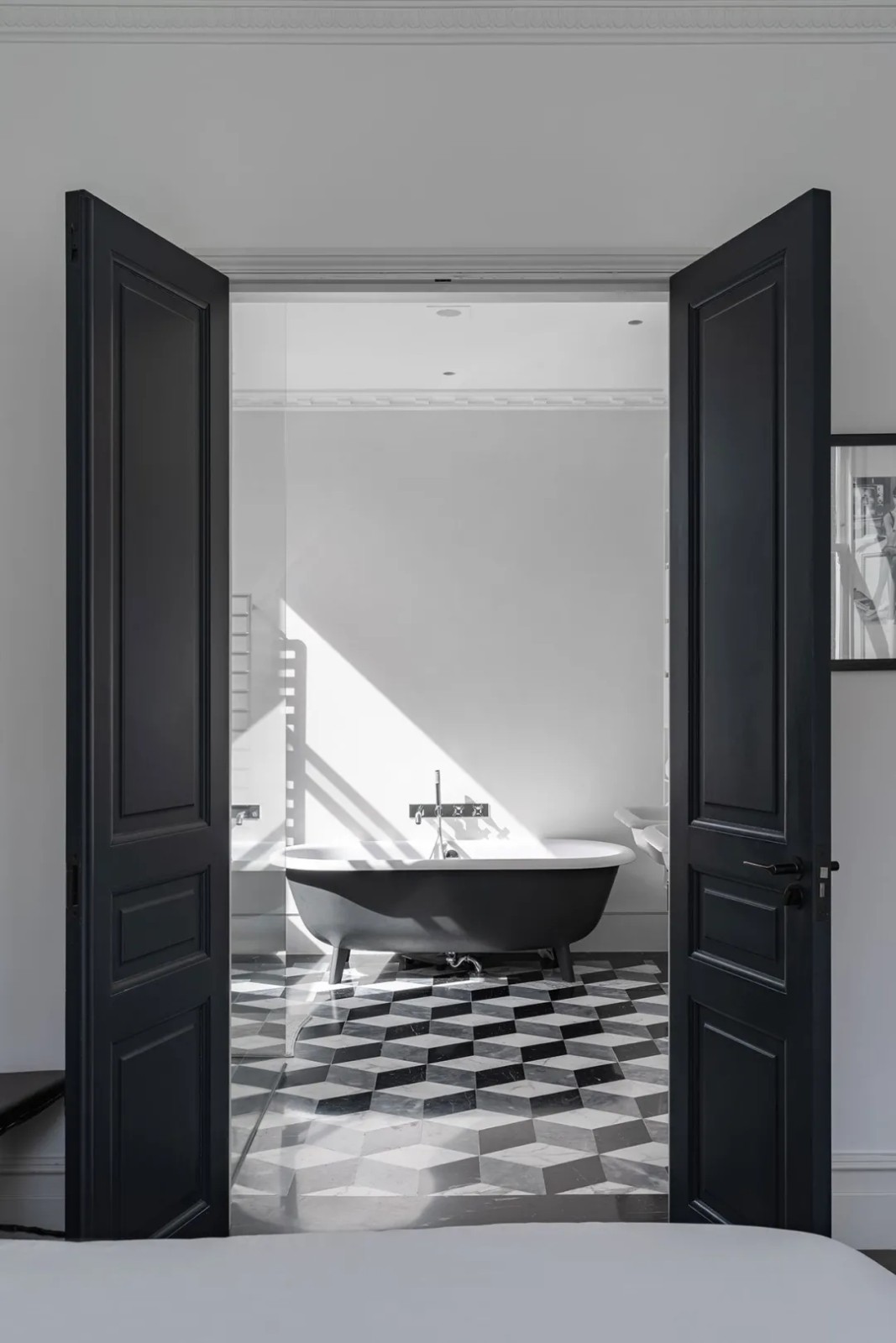 在二楼,四间明亮通风的卧室和一个走廊式步入式衣橱是简约优雅的典范,浴室中的几何瓷砖和意想不到的天窗增添了俏皮的气息。