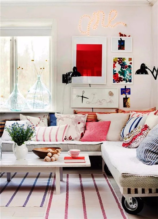 你可以把电影里的灵感直接运用过来,冷色调的翠绿造成视觉上的后退感,令空间扩大而富有层次,鲜红色沙发像两朵盛放的玫瑰,热烈而醒目,整个空间在这两种色彩的碰撞下极富活力。